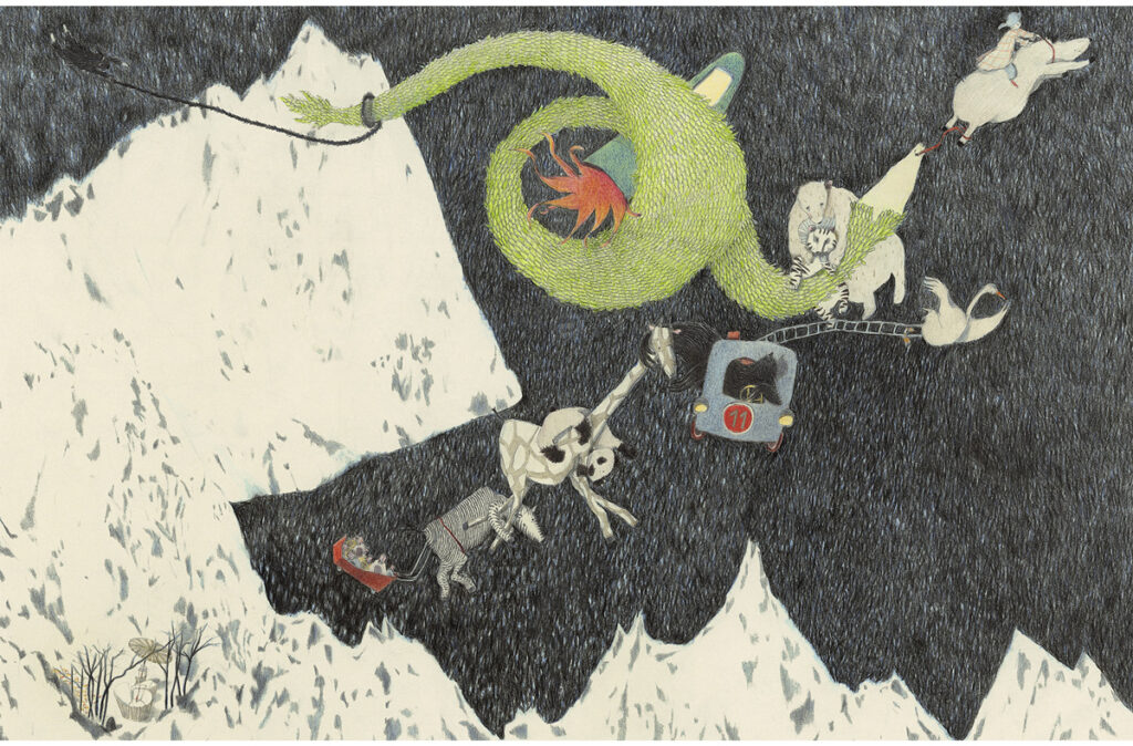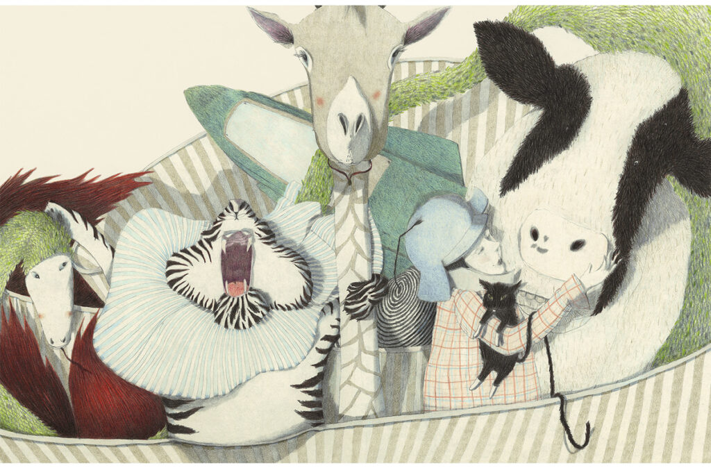 Très attachée à la Corse où elle se rend régulièrement, Isabelle Chatellard a réalisé une série de paysages à la mine graphite, présentés dans l’exposition. Mais c’est bien sûr son actualité en termes d’édition qui est à l’honneur avec Le Grand, le très grand tour de manège co-signé avec Hubert Ben Kemoun (L’École des Loisirs, 2025).